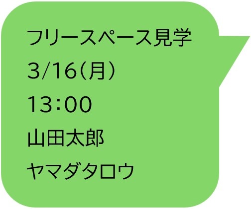 ・フリースペース見学希望 ・ご来店日 ・時間 ・お名前 ・フリガナ